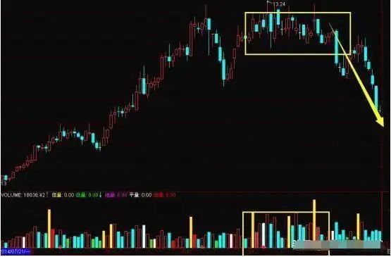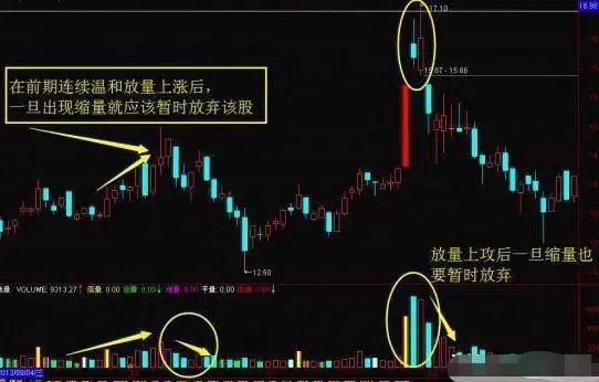 股价不断放量缩量大幅上涨后,一旦出现放量滞涨状态果断离场,成交量不能只参考急速上涨时的高成交量,主要参考前期平台整理及初始上涨时成交量。