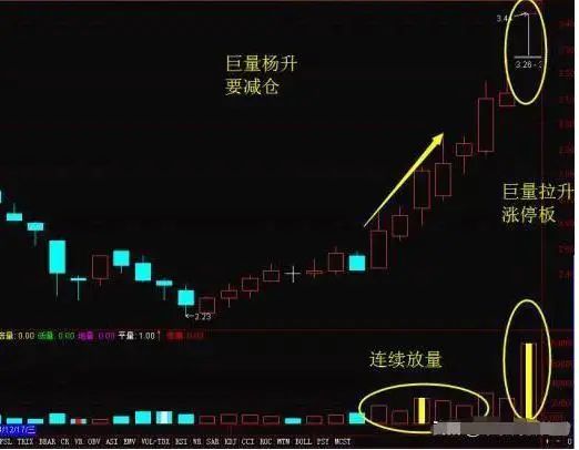8.巨量扬升要减仓:股价大幅上涨同时成交量急速放大,达到前期成交量或者昨日成交量2.5倍以上,后续回调概率大,可做减仓动作。